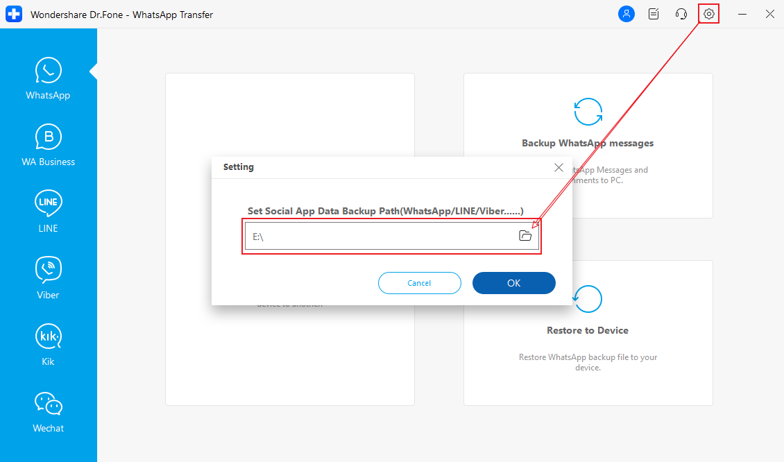 Open Dr.Fone-WhatsApp Transfer, click on Settings in the top right corner, and select the desired backup path in Set Social App Data Backup Path.