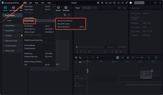 From the main editing interface of Filmora, navigate towards the "File" tab and click it. From the dropdown menu, choose the "Record Media" option and further select the recorder you want to use.